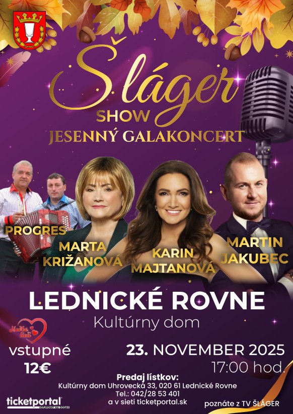 Obec Lednické Rovne Vás srdečne pozýva na jesenný galakoncert Šláger show, ktorý sa uskutoční v Kultúrnom dome v Lednických Rovniach 23.11.2025 o 17:00!